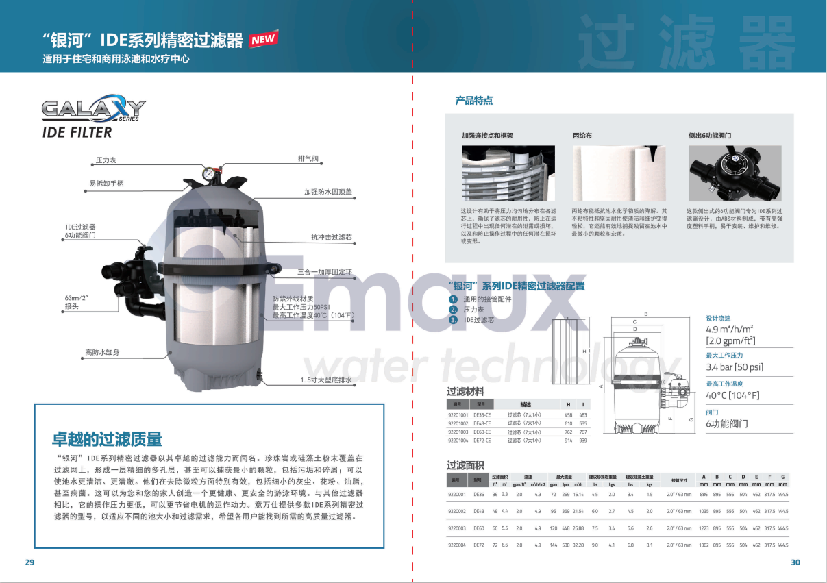 “銀河”IDE系列精密過濾器以其卓越的過濾能力而聞名。珍珠巖或硅藻土粉末覆蓋在 過濾網上,形成一層精細的多孔層,甚至可以捕獲最小的顆粒,包括污垢和碎屑;可以 使池水更清潔、更清澈。他們在去除微粒方面特別有效,包括細小的灰塵、花粉、油脂, 甚至病菌。這可以為您和您的家人創(chuàng)造一個更健康、更安全的游泳環(huán)境。與其他過濾器 相比,它的操作壓力更低,可以更節(jié)省電機的運作動力。意萬仕提供多款IDE系列精密過 濾器的型號,以適應不同的池大小和過濾需求,希望各用戶能找到所需的高質量過濾器。