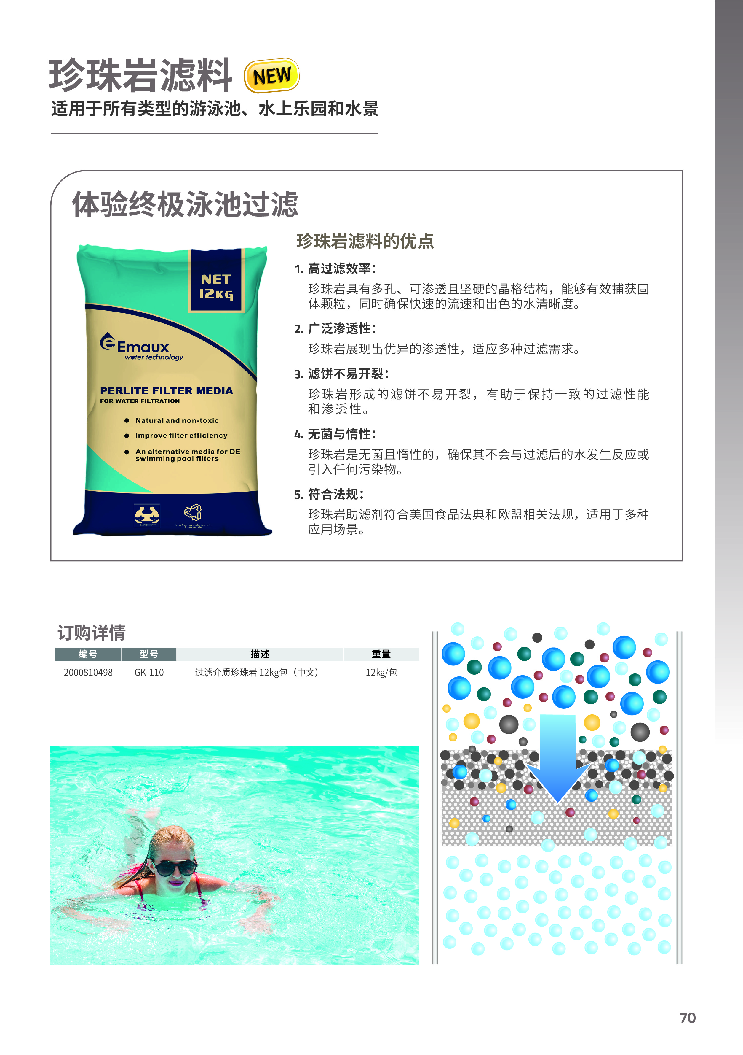競技池珍珠巖濾料的優(yōu)點: 1.?過濾效率: 珍珠巖具有多孔、可滲透且堅硬的晶格結構,能夠有效捕獲固 體顆粒,同時確??焖俚牧魉俸统錾乃逦?。 2.廣泛滲透性: 珍珠巖展現出優(yōu)異的滲透性,適應多種過濾需求。 3.濾餅不易開裂: 珍珠巖形成的濾餅不易開裂,有助于保持一致的過濾性能 和滲透性。 4.無菌與惰性: 珍珠巖是無菌且惰性的,確保其不會與過濾后的水發(fā)生反應或 引入任何污染物。 5.符合法規(guī): 珍珠巖助濾劑符合美國食品法典和歐盟相關法規(guī),適用于多種 應用場景。
