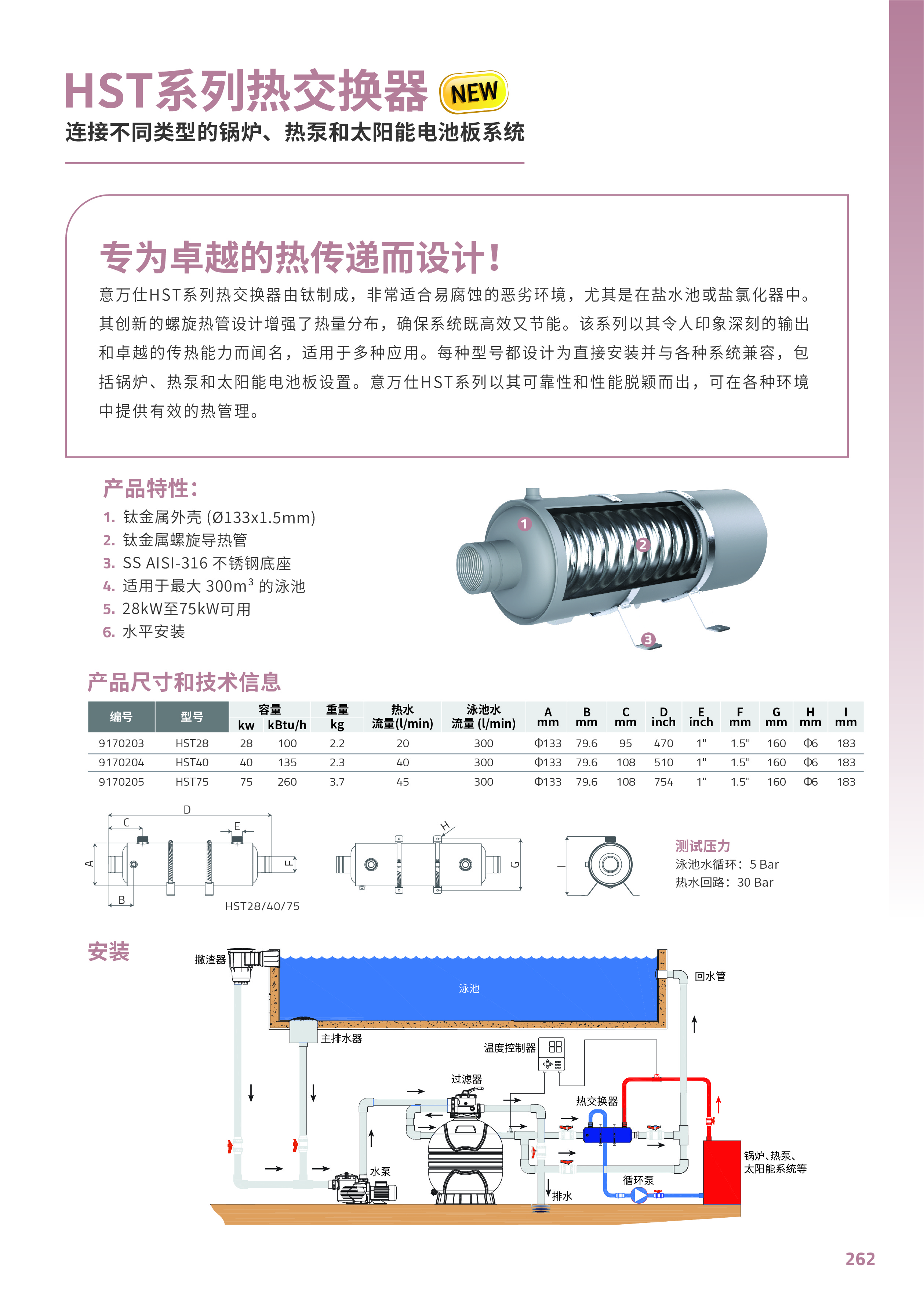 競(jìng)技池意萬(wàn)仕HST系列熱交換器由鈦制成,?常適合易腐蝕的惡劣環(huán)境,尤其是在鹽水池或鹽氯化器中。 其創(chuàng)新的螺旋熱管設(shè)計(jì)增強(qiáng)了熱量分布,確保系統(tǒng)既?效?節(jié)能。該系列以其令?印象深刻的輸出 和卓越的傳熱能力而聞名,適用于多種應(yīng)用。每種型號(hào)都設(shè)計(jì)為直接安裝并與各種系統(tǒng)兼容,包 括鍋爐、熱泵和太陽(yáng)能電池板設(shè)置。意萬(wàn)仕HST系列以其可靠性和性能脫穎而出,可在各種環(huán)境 中提供有效的熱管理。
