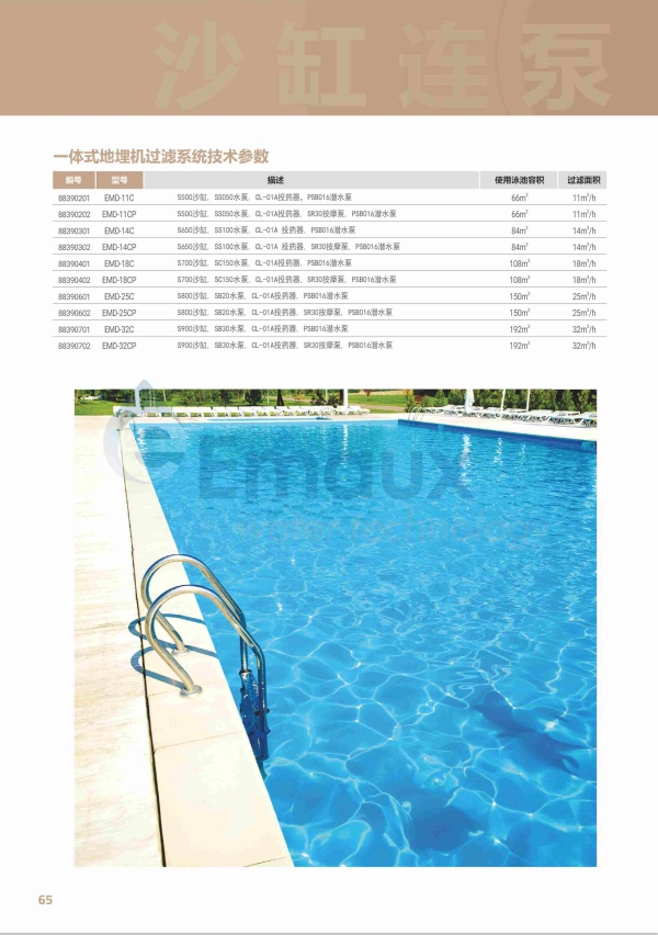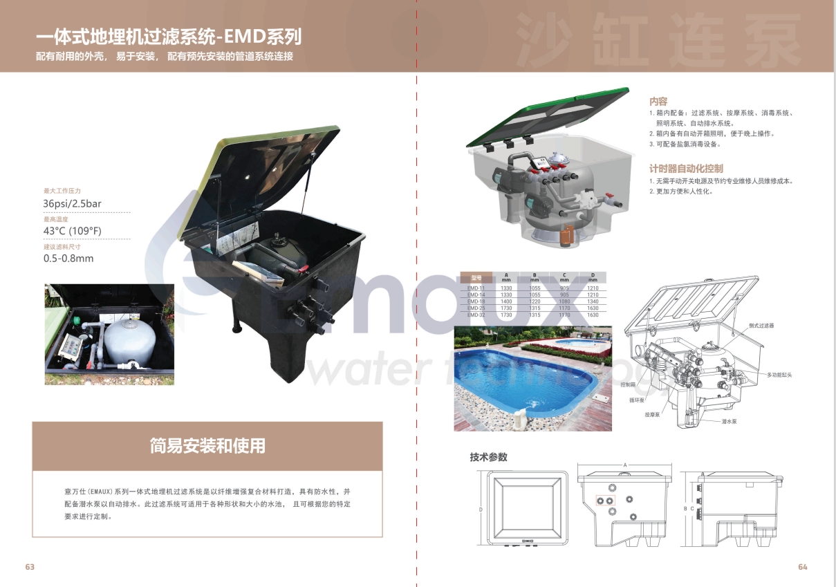 競技池意萬仕(EMAUX)系列一體式地埋機過濾系統(tǒng)是以纖維增強復合材料打造,具有防水性,并配備潛水泵以自動排水。此過濾系統(tǒng)可適用于各種形狀和大小的水池, 且可根據您的特定要求進行定制。