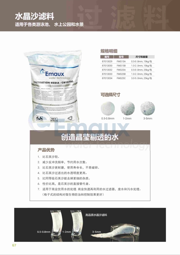 競技池由于其高的過濾質(zhì)量,水晶沙已在很大程度上取代了傳統(tǒng)的石英沙。它通過去除更精細(xì)的雜質(zhì)來提高水的透明度,并通過減少電力反沖洗來節(jié)約用水。