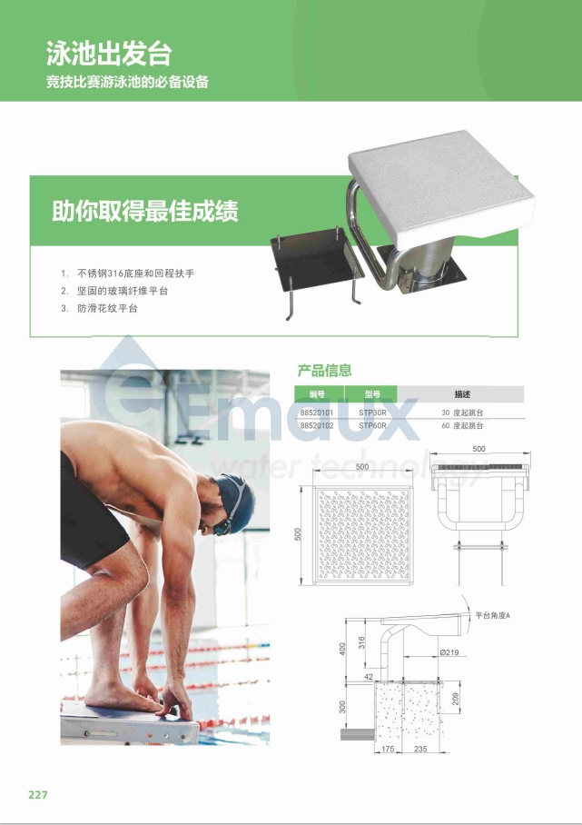 競(jìng)技池1. 不銹鋼316底座和回程扶手 2. 堅(jiān)固的玻璃纖維平臺(tái) 3. 防滑花紋平臺(tái)