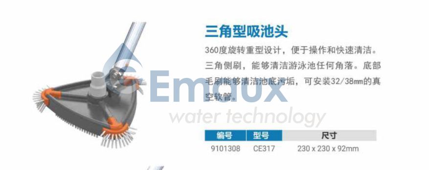 競(jìng)技池360度旋轉(zhuǎn)重型設(shè)計(jì),便于操作和快速清潔。三角側(cè)刷,能夠清潔游泳池任何角落。底部毛刷能夠清潔池底污垢,可安裝32/38mm的真空軟管。