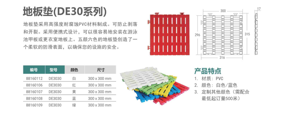 您的位置:首頁>產(chǎn)品概覽>泳池格柵>地板墊(DE30系列)